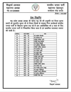 माननीय प्रदेश अध्यक्ष, भाजपा उत्तराखण्ड श्री Mahendra Bhatt जी की अनुमति एवं जिला चुनाव प्रभारी श्री Kuldeep Kumar जी से विचार विमर्श के पश्चात निम्न कार्यकर्ता भारतीय जनता पार्टी के खिलाफ चुनाव लड़ रहे हैं । अतः अधोलिखित को छ: साल के लिए भारतीय जनता पार्टी से निष्कासित किया जाता है एवं प्राथमिक सदस्यता समाप्त की जाती है।