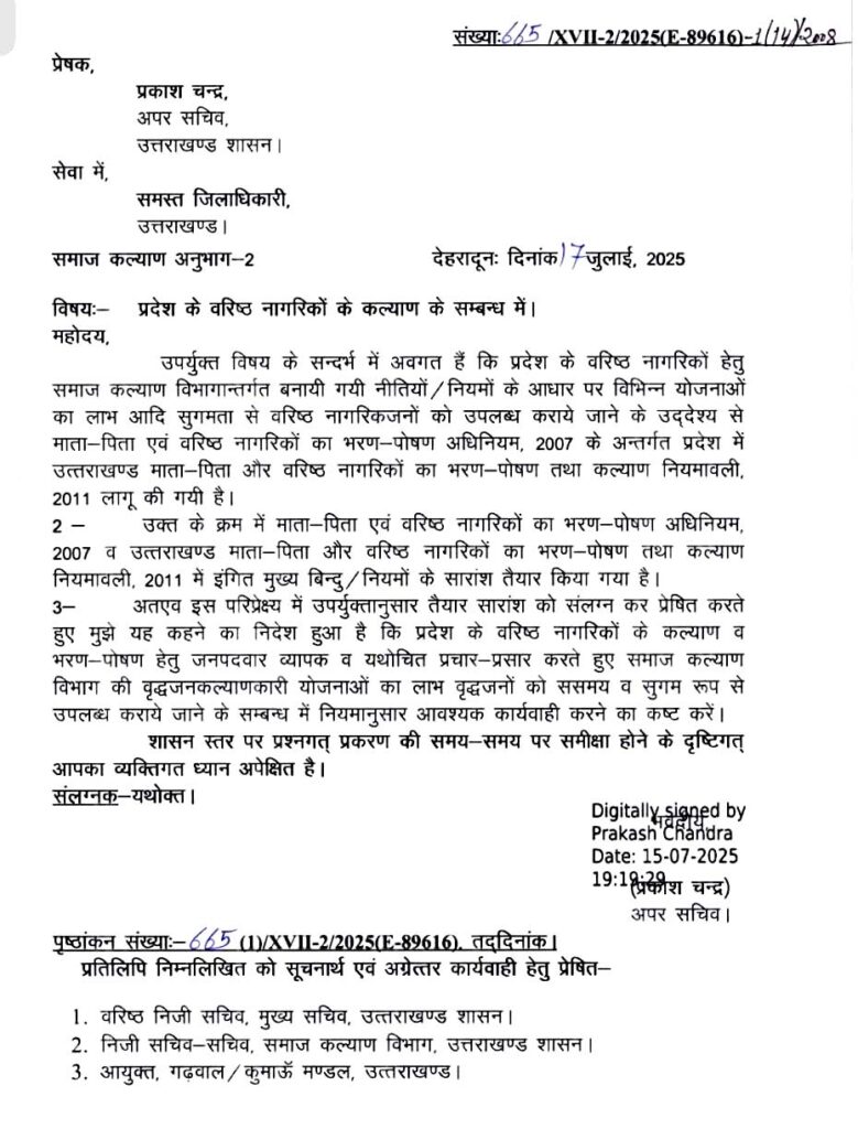 संयुक्त नागरिक संगठन के कार्यकारी उपाध्यक्ष गिरीश चंद्र भट्ट और महासचिव सुशील त्यागी ने कुछ दिन पूर्व मुख्य सचिव आनंदवर्धन से भेंट कर “उत्तराखंड माता-पिता और वरिष्ठ नागरिकों का भरण-पोषण नियमावली 2011” को कड़ाई से लागू करने की मांग की थी। इसके बाद, समाज कल्याण विभाग के सचिव द्वारा 17 जुलाई को सभी जिलाधिकारियों को विस्तृत निर्देश जारी किए गए।